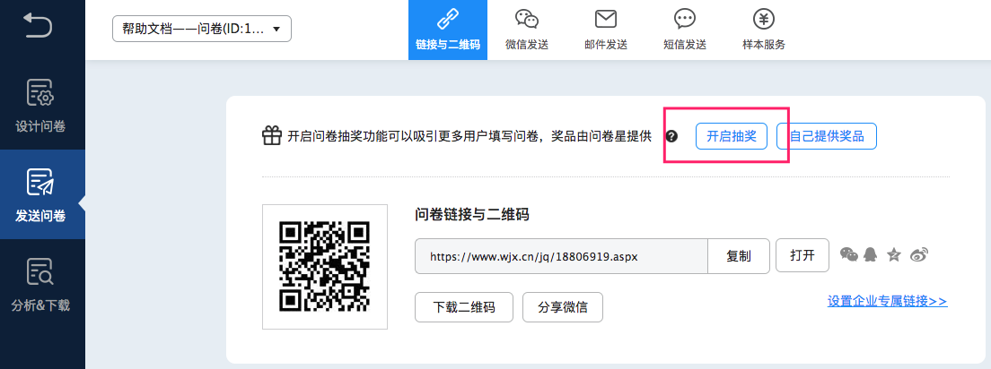 为吸引更多用户来填写您的问卷,可在链接与二维码页面开启系统自带的抽奖功能哦,奖品都是由问卷星提供的。